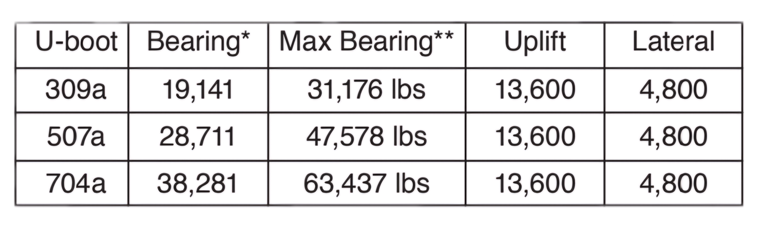 Shear & Uplift assume (10) 16d nails. The use of (4) 1/4” lags alone reduces Uplift to 800lbs. Bearing assumes a Utility Grade Douglas Fir beam at 625 psi compressive strength perpendicular to the grain. **Maximum bearing is based on 1000 psi perpendicular. For larger load capacities consult with supplier.